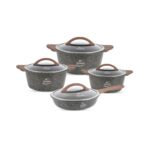 سه عدد قابلمه جدنى در اندازه هاى 20 – 24 – 28 و تابه در اندازه 28 با درب شيشه اى بسيار بادوام و دسته هاى نسوز (دسته هاى قابلمه هاى از جنس جوبى) ميباشد . اين سرويس قابلمه و تابه كيفيت ساخت بسيار بالايى دارد . كفه بيرونى قابلمه طورى طراحى شده است كه كرما