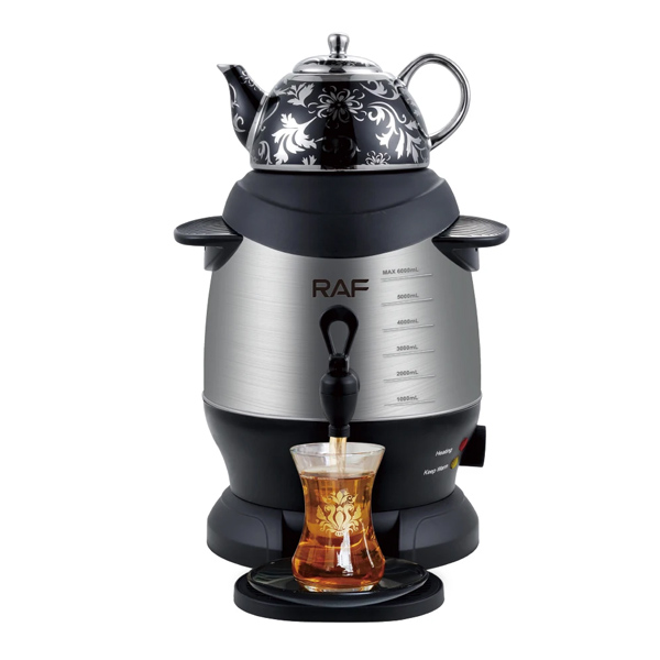 برقی 6 لیتری 1800 وات راف مدل 7115 از سری محصولات باکیفیت برند معتبر RAF است که به دلیل محبوبیت نوشیدنی چای در کشور ایران، این سماور برقی بسیار پرفروش و پرطرفداراست. کتری 6 لیتری این سماور برقی با توان 1800 وات از جنس استیل ضدزنگ و جنس داخل کتری از استیل ورق بسیارضخیم ساخته شده است که مقاومت و عایق خوبی دارد همچنین جنس قوری 1 لیتری نیز سرامیکی مرغوب است که حجم خوبی از چای را در خود گرم نگه میدارد. بدون شک سماور برقی 6 لیتری 1800 وات راف مدل 7115 با قابلیت هایی مانند ترموستات قطع کن خودکار پس از جوش آمدن و یا درصورت خالی بودن حجم آب، سینی چکه گیر، کلید روشن و خاموش و تنظیم میزان گرما، چراغ نشانگر، دستگیرههای عایق و پلاستیکی و سایر قابلیت های کاربردی، ارزش خرید سماور برقی راف 7115 را به خوبی بالا برده است.می