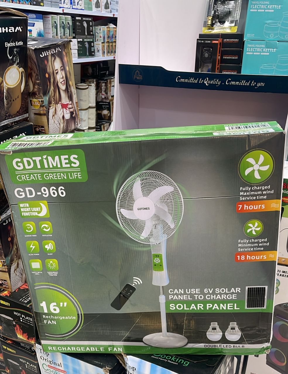 پنکه شارژی ایستاده چرخشی ۷ ساعت نگهداری شارژ سفه خورشیدی ۲۰ در ۲۰ داره ۲ تا چراغ شارژی روش هست